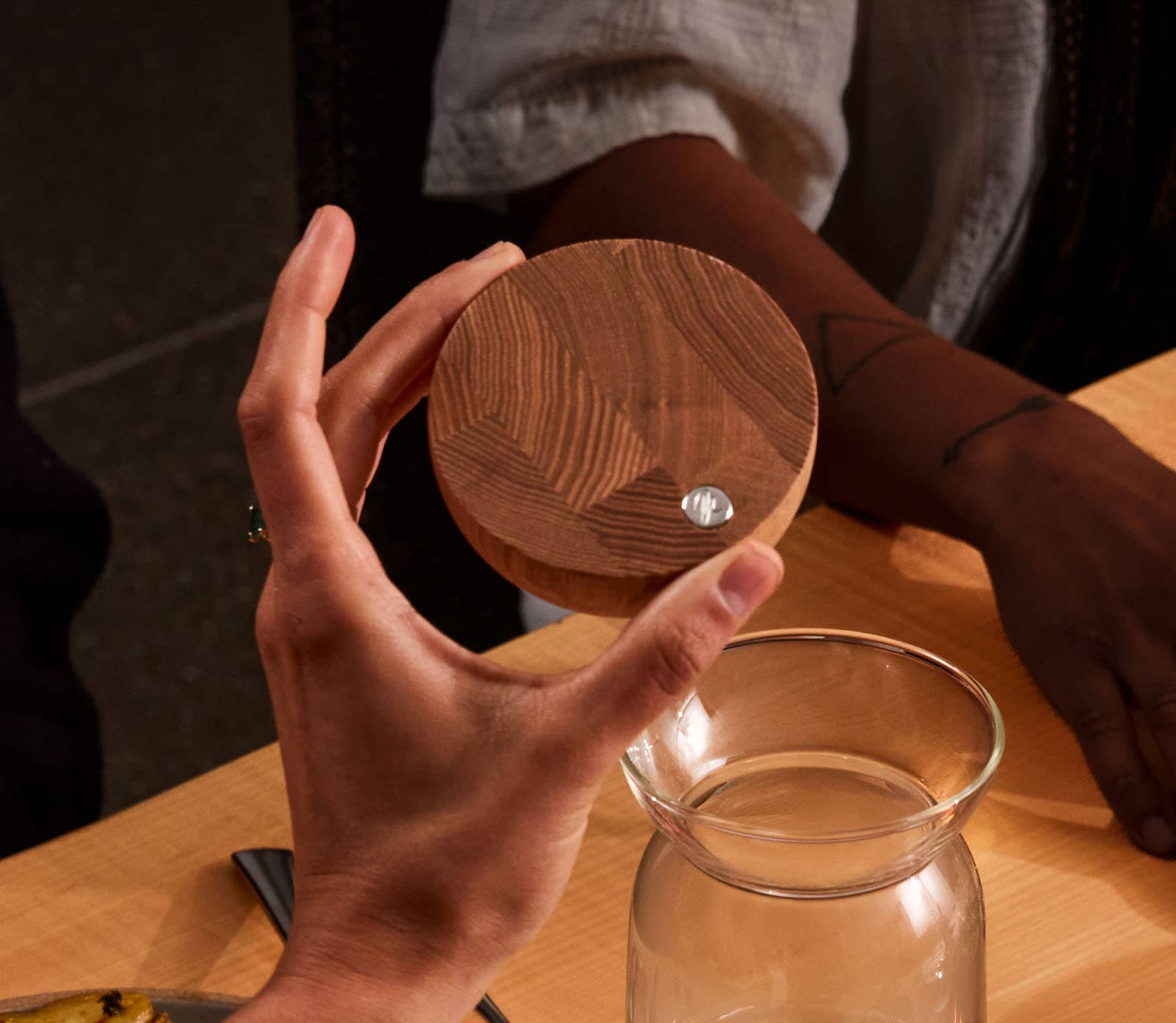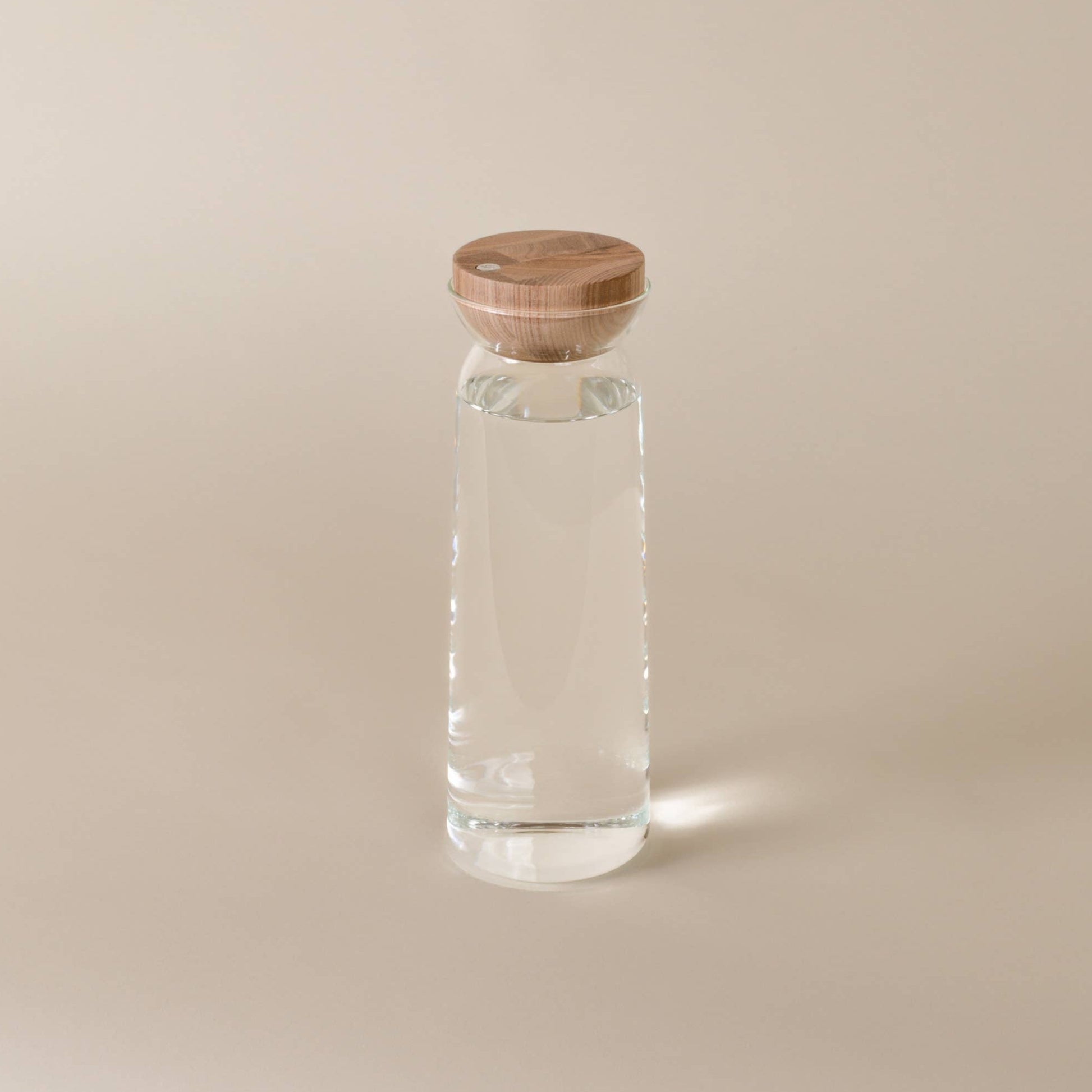 Made of hand-blown glass, the Teeter Carafe has a small footprint yet a generous capacity to serve water, juice, cocktails, or whatever your favorite beverage might be. The playful ash wood top accentuates the reflected glass form while protecting beverages. The glass lip provides a controlled pour that arcs into the glass