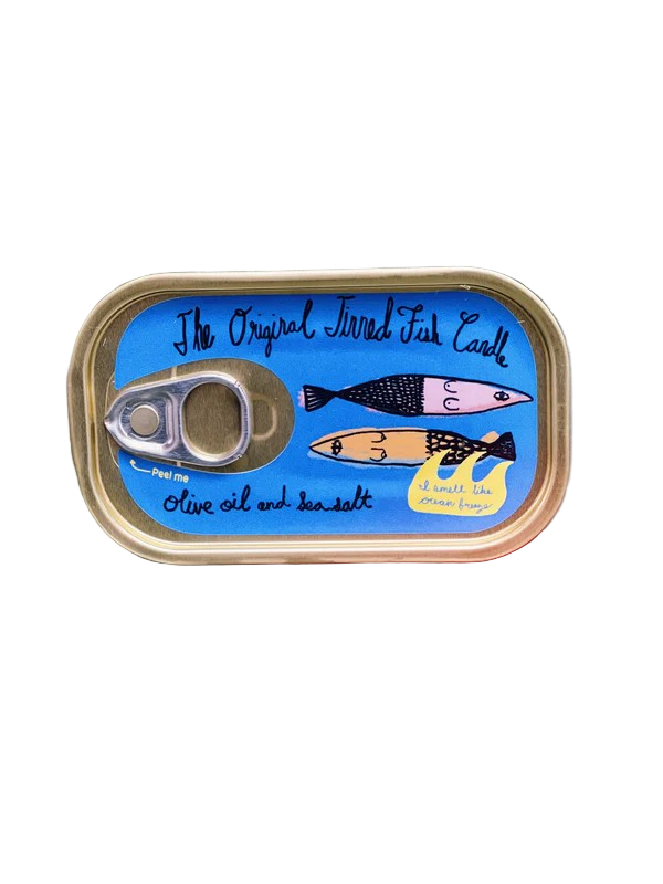 Experience the enchantment of Tinned Fish candles: hand-poured soy candles that mimic sardine cans. The magic begins as you peel back the tin lid, revealing a whimsical scene reminiscent of actual sardines in a tin. Dive into a sea of vibrant fish shapes elegantly suspended in olive oil-colored wax. Available in three different scents.